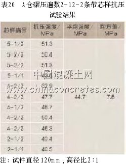 A倉碾壓遍數2-12-2條帶芯樣抗壓試驗結果(表20)。