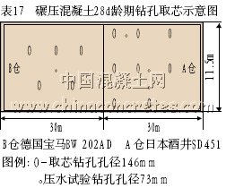碾壓混凝土28d齡期鉆孔取芯示意圖(表17)。
