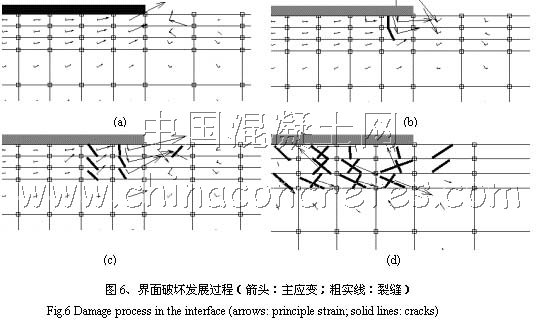 根據(jù)試驗(yàn)觀察剝離面,其剝離層厚度存在一定程度的變化,從零點(diǎn)幾到幾個(gè)毫米都有可能。因此,界面混凝土層的厚度也較難預(yù)先給定。同時(shí),纖維應(yīng)力變化和混凝土微裂縫開展深度有著較明顯的關(guān)系,這些尺寸都難于在分析前加以界定。