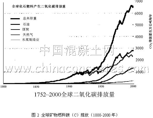 在人類發展的歷史過程中,20世紀是最活躍的時期,人類80%的科學技術成就是在這100年內完成的,生產力也長足增長,能耗和氣體排放也以前所未有的速度增加。圖1所示為1990~2006年的CO2的排放量[3],從圖中可以看出俄羅斯、日本、歐盟、美國基本上保持穩定,增長最多所占比例日益增大的是中國,以至2006年中國的CO2排放量居世界第一位。圖2所示為1800~2000年的CO2排放量,從圖中可以顯著看出增加最快的是上世紀的后50年[3]。