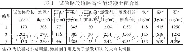 通過(guò)試驗(yàn)室材料試驗(yàn),進(jìn)行混凝土配合比的優(yōu)選,確定了UFA 摻量為20%~40%。施工過(guò)程中,考慮到氣溫在0~5℃之間,將試驗(yàn)路段UFA 的摻量由40%改為25%。UFA 具體摻量及混凝土現(xiàn)場(chǎng)試驗(yàn)配合比見(jiàn)表1。