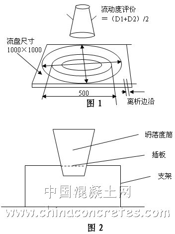 1、塌落流動度法:(塌落度筒)評價混凝土的塌落流動度、擴展度、流下時間、中邊差(塌落度試驗中點與邊緣之差)。(圖1)