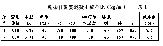 水膠比為0.28-0.40;混凝土拌合物中膠潔材料漿體積占35-45%;砂率值為45-50%;減水劑摻量0.75-2.5%;KM超細粉煤灰摻量25-40%。