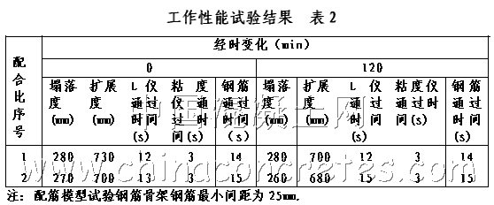 工作性能的試驗結果是:塌落流動度260-280mm,擴展度大于600mm,L型箱通過時間<15s,粘度測定儀通過時間<5s,鋼筋通過時間<15s。