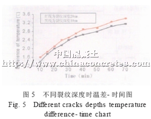 筆者對(duì)電阻率較高, 但裂紋深度不同的碳纖維混凝土試樣進(jìn)行了紅外檢測(cè)。對(duì)于碳纖維含量占水泥重量的0.5%, 配比為水泥: 沙: 水=1: 25: 0.6 碳纖維水泥膠沙試樣, 裂紋深度分別為20mm、10mm, 切口寬度均為0.1mm 的大電阻試樣, 不同裂紋深度情況下, 板中心線與邊緣間表面最高溫差隨通電時(shí)間的變化見圖5。從圖中可見即使對(duì)大電阻試樣, 其裂紋深度的影響也是可見的, 同時(shí)也進(jìn)一步為用紅外熱像檢測(cè)提供了實(shí)驗(yàn)依據(jù)。