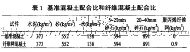 試驗用混凝土為牡丹江牌普通硅酸鹽水泥42(5# 摻火山灰),砂為松花江產中砂,粗集料為阿城產碎石,纖維摻量為0.9kg/m3,混凝土配合比如表1 所示。聚丙烯纖維網最突出的優點是分散均勻、便于施工,無須改變原有水泥混凝土的施工方法和混凝土配合比,這也是有別于其它纖維( 鋼纖維等)優點之一。攪拌方法與普通混凝土一致,拌和時間取4 分30s。