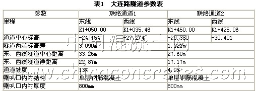 為滿足功能需要,在距兩圓隧道端部各1/3處設立兩個聯絡通道,均位于黃浦江底,位于浦西岸邊的為聯絡通道1、浦東岸邊的為聯絡通道2。兩通道相距約400m,具體參數見表1。聯絡通道與東、西線隧道接近正交連接,斷面為圓拱形,凈高2.70m,凈寬1.40m,凈截面積3.67m2,結構為單層鋼筋混凝土,厚度為400mm。在聯絡通道與隧道連接處襯砌較厚,呈喇叭口狀,開挖輪廓高5.30m,寬3.80m,開挖面積為19.37m2,如圖1所示。