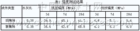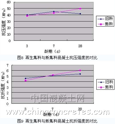 a.與新料試件相比,舊料試件早期強度值高,后期強度值低,強度值不能很好達到要求(按抗壓強度為控制指標)。