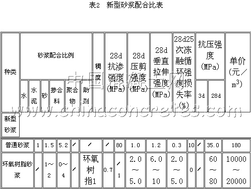 一般建筑物少量混凝土修補(bǔ)可使用高性能砂漿,砂漿配合比見(jiàn)表2。不需澆水潤(rùn)濕混凝土基面,砂漿可直接用于干凈的光滑混凝土或破損混凝土基面,并能夠和基層牢固粘結(jié)為一體,表面形成的一層致密堅(jiān)固的砂漿層能夠隔斷水分的透過(guò),有效的保護(hù)破損混凝土面。