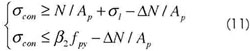 熱處理鋼筋、冷拔低炭鋼絲:0.4fptk≤σcon≤0.70fptk,冷拉鋼筋:0.5fptk≤σcon≤0.90fptk,對于預應力撐桿,σcon取值還必須受施工階段的穩定要求控制,否則應采用多道專用卡具等輔助防失穩措施。預應力撐桿加固柱,撐桿與構件之間宜采用環氧樹脂灌漿濕式連接,此時,綴板(連接箍板)應緊貼構件結合表面與角鋼平焊連接。為避免撐桿因焊接受熱而產生過大的預應力損失,施焊應采取上下綴板輪流進行。預應力拉桿、撐桿、綴板及各種錨固連接件,均應采用有效的防腐、防火保護措施。