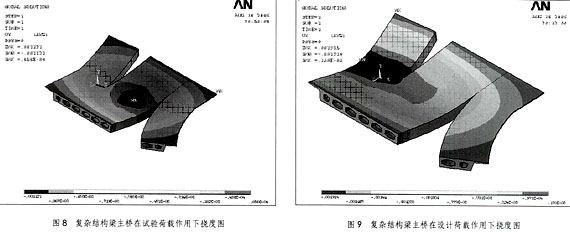 經過有限元軟件ANSYS分析,試驗跨在最大正彎矩作用下的最大撓度為1.914mm,位于跨中位置,見圖8。在設計荷載作用下的最大撓度為2.571mm,位于跨中位置,見圖9。