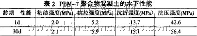 該種堵漏的方法,主要是應(yīng)用在水下或地下混凝土在涌水的條件下的孔隙、孔洞和裂縫的快速封堵。在封堵這樣的漏水部位,往往要比其它的滲、漏要困難得多,且堵水效果要略差一些,但只要在處理時(shí)按要求操作,可保證混凝土表面不摻水。這種材料有的叫快速堵漏劑,也有的稱為PBM聚合物,其聚合物混凝土的水下性能見(jiàn)表2。