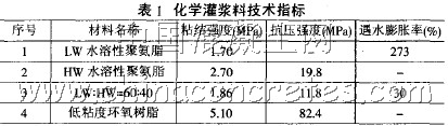 化學(xué)灌漿堵漏,是采用一種化學(xué)灌漿料來(lái)解決混凝土形成的線型摻、漏的部位,一般這種滲、漏是一條線,堵漏時(shí)要采取化學(xué)灌漿料與快速凝結(jié)水泥和無(wú)收縮水泥砂漿配合使用,才能真正達(dá)到堵漏效果;化學(xué)灌漿料一般分為四種型號(hào),它們的技術(shù)指標(biāo)見(jiàn)表1。