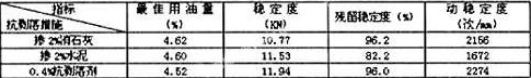我們選用磨耗層AK-16A目標(biāo)配合比10—20mm石:瓜米石:石屑:砂:礦粉=40:20:20:15:5為基本配合比,分別采用摻2%消石灰、2%水泥及4‰抗剝落劑三種抗剝落措施進(jìn)行配合比設(shè)計和配合比驗證以便進(jìn)行對比,其結(jié)果如下: