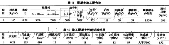 從表9可得結論:人工砂、5 - 10mm粗骨料的引人混凝土強度提高,混凝土擴展度增大、倒流時間縮短,根據以上試驗結果降低混凝土用水量有了空間,從降低用水量,減少膠凝材料總量,減小混凝土自收縮角度出發對混凝土配合比進一步調整,試驗結果見表10。