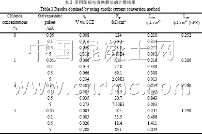 表2 所示為運(yùn)用陽(yáng)極電流換算法得到的各試樣在不同擾動(dòng)信號(hào)強(qiáng)度下的計(jì)算結(jié)果。通過(guò)與線性極化測(cè)試結(jié)果對(duì)比可以發(fā)現(xiàn):當(dāng)外加電流較低時(shí)(如0.05mA),各試樣所得的計(jì)算結(jié)果均偏低,尤其是Cl-含量為3%及5%試樣的偏離度已將近一個(gè)數(shù)量級(jí)。這是由于采用該法計(jì)算時(shí)忽略了陰極電流的影響,從而低估了外測(cè)電流值。當(dāng)脈沖電流為0.5mA 時(shí)所得Icorr值則較為理想。然而,當(dāng)施加的脈沖電流達(dá)到5mA 時(shí),通過(guò)陽(yáng)極電流換算法得到的腐蝕速率值均比實(shí)際值低一至兩個(gè)數(shù)量級(jí)。這可能是因?yàn)樵诖箨?yáng)極電流情況下鋼筋極化進(jìn)入強(qiáng)極化區(qū),此時(shí)陽(yáng)極Tafel 斜率ba 仍沿用假定的0.07 已不合適,宜重新對(duì)ba 的取值進(jìn)行校正,如另行采用基準(zhǔn)試樣對(duì)所測(cè)的Tafel 極化曲線進(jìn)行直線外推法擬合,從而得到較合理的ba 值。