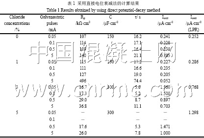 運(yùn)用直接電位衰減法計(jì)算得到的各試樣在不同擾動(dòng)信號(hào)強(qiáng)度下的結(jié)果見表1,為方便對(duì)比,表中也同樣給出了線性極化法的測(cè)試結(jié)果。其中5% Cl-含量試樣由于在小脈沖電流下的衰減曲線正常,無(wú)法按照此法進(jìn)行計(jì)算。由表1 可以看出,在腐蝕輕微的情況下,施加小脈沖電流后計(jì)算得到Icorr 值與線性極化法測(cè)試值較為一致。當(dāng)脈沖電流達(dá)到5mA 時(shí),所得到的Icorr 值明顯偏低,此現(xiàn)象反映在0%及1% Cl-含量試樣上。這說(shuō)明在5mA 的陽(yáng)極電流下鋼筋極化已顯著超出線性區(qū)域范圍,因而無(wú)法有效利用所提出的電路模型對(duì)暫態(tài)響應(yīng)信號(hào)進(jìn)行分析。當(dāng)腐蝕較嚴(yán)重時(shí)情況卻恰恰相反,在施加大的脈沖電流下所得Icorr 值與線性極化法吻合較好,而采用小的擾動(dòng)信號(hào)則高估了腐蝕速率大小。因此,有必要在施加脈沖信號(hào)之前確定鋼筋的腐蝕程度,這不僅有助于選擇合適的脈沖電流大小,同時(shí)也對(duì)雙層電容C 值的選擇具有指導(dǎo)意義。比較有效也簡(jiǎn)便的辦法是采用自然電位法,但測(cè)量之前需要考慮環(huán)境因素以及鋼筋混凝土自身的狀況,如環(huán)境溫度、濕度、混凝土飽水率、保護(hù)層厚度、鋼筋是否有防護(hù)涂層等。