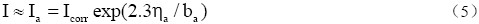 當(dāng)施加的電流對(duì)鋼筋產(chǎn)生陽(yáng)極極化時(shí),假定鋼筋電位處于Tafel 區(qū)域,此時(shí)的陽(yáng)極極化電流可近似認(rèn)為是外測(cè)電流[24,25]: