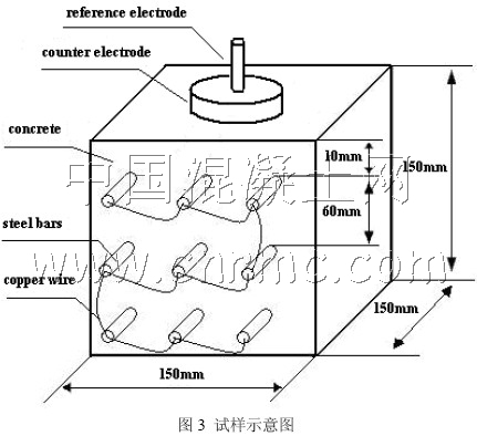 試驗(yàn)所用試樣如圖3 所示,總共成型4 塊試樣,其中Cl-含量占水泥質(zhì)量分別為0%、1%、3%、5%。試驗(yàn)用水泥為安徽海螺P.O.42.5 級(jí)普通硅酸鹽水泥,細(xì)集料為中砂,粗集料為石灰?guī)r碎石,顆粒級(jí)配5mm~25mm,混凝土配合比為:水泥:水:砂:碎石=1:0.5:1.7:3.4,在成型的同時(shí)摻入NaCl。試樣規(guī)格為150mm×150mm×150mm,試樣中埋入9 根Φ8mm 鋼筋,澆注混凝土前用砂紙除去鋼筋表面銹層,并用丙酮去除油污。鋼筋分3 層平行排列,埋入深度為10mm,混凝土保護(hù)層厚度為10mm,鋼筋間距60mm。裸露出的鋼筋以及相應(yīng)的混凝土面均用環(huán)氧樹脂包封以杜絕接觸腐蝕。在每根鋼筋端部引出銅導(dǎo)線,通過(guò)導(dǎo)線將所有的鋼筋連接起來(lái)以形成連續(xù)的鋼筋網(wǎng)絡(luò)。所有試樣成型之后在室溫下濕養(yǎng)護(hù)28d 待測(cè)。