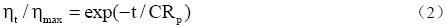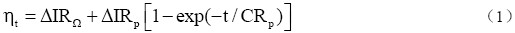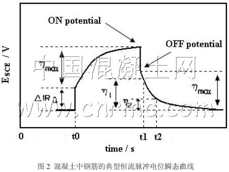 一旦外加電流被切斷,歐姆降ΔIRΩ 對(duì)電位ηt 的貢獻(xiàn)迅速消失,時(shí)間短至幾毫秒,此刻的電位反映出鋼筋的真實(shí)極化電位。隨后鋼筋電位隨著時(shí)間呈指數(shù)形式衰減,如下式: