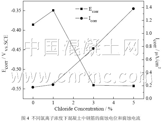 圖4 所示為不同Cl-含量試樣的自腐蝕電位Ecorr 和線性極化測(cè)試結(jié)果得到的腐蝕電流Icorr。正如預(yù)計(jì),隨摻入的Cl-含量升高,鋼筋腐蝕程度加劇,即自腐蝕電位Ecorr 隨著氯含量的升高而下降,同時(shí)腐蝕電流Icorr 大幅上升。尤其是Cl-摻量為5%的試樣,其腐蝕電流超過(guò)了1μA/cm2,可以認(rèn)為其腐蝕速率較大。值得注意的是,氯含量為0%試樣的自腐蝕電位與1%試樣較為接近,其腐蝕速率高于0.1μA/cm2,表明已經(jīng)處于腐蝕狀態(tài)。究其原因,可認(rèn)為是由于經(jīng)過(guò)多次噴灑氯鹽之后,在干濕交替作用下鹽分已逐漸侵入混凝土內(nèi)部并到達(dá)鋼筋表面,造成鋼筋腐蝕。在混凝土表層干濕交替的過(guò)程中,當(dāng)表層風(fēng)干到一定程度時(shí),氯化物能依靠混凝土毛細(xì)管吸收作用逐漸侵入混凝土內(nèi)部,且風(fēng)干程度越高,毛細(xì)管吸收作用越大。在下一次再被海水潤(rùn)濕時(shí),又有更多的鹽分以溶液形式帶進(jìn)混凝土的毛細(xì)管孔隙中。因此造成由混凝土表層指向內(nèi)部鋼筋的氯化物濃度差被不斷拉大,加速了氯化物的擴(kuò)散。隨著時(shí)間的推移,最終將有足以使鋼筋去鈍化的氯化物到達(dá)鋼筋表面。