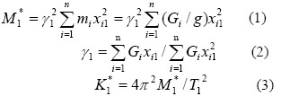 式中:M*1為第1 階振型的等效質量;K*1為第1 階振型的等效剛度; γ1 為第1 階振型的參與系數;Xil為第1 階振型i 質點的水平相對位移;Gi為集中于質點i 的重力荷載代表值;mi為第i 層的質量;T1為第1 階振型的自振周期。其它各階參數可相應求解。