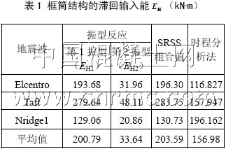 將多自由度體系等效為單自由度體系以后,即可根據其能量方程求解出相應的滯回耗能。本文通過輸入以下三條地震波:1940 年南北向EL Centro 波,1952 年69°Taft 波和1994 年90°Northridge 地震波,將各地震波前二階組合結果的均值作為該框筒結構的等效滯回輸入能并與相應的非線性動力時程分析做了對比,從表1 中看出,由于沒考慮結構的空間作用效應,時程分析求得的滯回耗能比采用等效單自由度體系的要小。