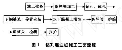 在水利工程中, 經常會遇到修建跨河橋工程, 而樁基礎又是橋梁設計中最常用的一種施工方法。近年, 筆者在工作中遇到的幾個工程均采用了鉆孔灌注樁的施工。下面簡要介紹橋基鉆孔灌注樁的施工工藝, 具體流程見圖1。