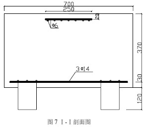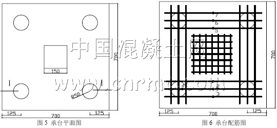 一四樁鋼筋混凝土厚承臺, 尺寸為700mm×700mm×400mm , 柱截面尺寸為150mm×150mm。為避免柱下局部承壓面過早破壞,在柱下20mm 處設置250 mm×250mm 鋼筋網片。承臺底部縱向鋼筋集中布置在樁徑范圍內,鋼筋的保護層厚度為30mm。為研究承臺的受力及破壞特征,就要保證柱、樁不先于承臺破壞,設定樁柱的材料為彈性,不考慮其塑性破壞。混凝土強度等級為C30。承臺平面圖及配筋圖如圖5、6 所示。
