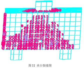 荷載加到373.5kN 時,承臺各個側面都形成豎向裂縫,隨著荷載的加大,豎向裂縫迅速向上發展,荷載加到475.875kN 時出現斜裂縫,豎向裂縫繼續向上發展,斜裂縫也迅速向上延伸與豎向裂縫相交,成為主裂縫,圖11 所示為承臺破壞時側面的裂縫圖。破壞荷載為1048kN。