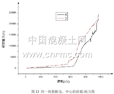 圖12 所示為沿相同方向布置的縱筋中點的荷載-軸力圖,圖13 所示為同一根縱筋樁邊、中心處的荷載-軸力圖,節點編號如圖6 所示。
