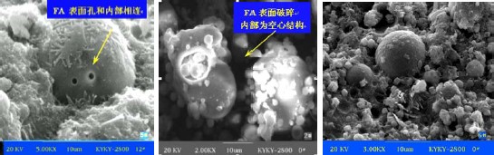 試驗結果還發現,隨FA 摻量的增加,試件對Cl-的物理吸附能力比化學結合能力提高快,且28d 時,隨FA 摻量增加,膠凝材料水化程度逐漸降低。這說明水泥中的粉煤灰仍有部分粉煤灰顆粒未能水化,由于粉煤灰顆粒具有較大的比表面積和空心結構,且較大的粉煤灰顆粒內部具有空腔,空腔通過氣孔與表面連接,粉煤灰內部對Cl-的吸附就在粉煤灰球體的表面和粉煤灰的內部空腔相同時進行,這樣就增加了吸附的有效面積,物理吸附的能力增強了,見圖4,在對摻FA 的膠凝材料水化產物用SEM 觀察時發現大量未水化的FA 顆粒,且部分FA 顆粒表面有氣孔和內部相連或是表面破碎,這樣都增大了FA 對Cl-物理吸附的有效面積。另據文獻[5]的研究,FA 顆粒本身就有一定的物理吸附Cl-的能力。