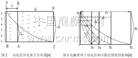 對氯離子的物理吸附主要是通過雙電層來完成的[3]。固體表面帶相反電荷的離子并不是完全正確的排列在一個面上,而是有一定的濃度分布,其電荷分布如圖2 所示。雙電層分為兩部分:一部分緊靠固體表面的不流動層,稱為緊密層,其中包含了被吸附的離子和部分過剩的異電離子,其厚度δ 約為幾個水分子大?。毫硪徊糠謴腁B 到CD,稱為漫散雙電層,在這個層中過剩的異電離子逐漸減少為零,這一層是可流動的。雙電層存在電位差ζ,對異電離子有影響。ζ 絕對值的大小與異電離子在雙電層中的分布有關。異電離子分布在緊密層越多,則ζ 電位絕對值越小,如果在外界環境加入電解質,離子濃度增大,電解質中與異電離子符號相同的離子會把異電離子擠入緊密層,這樣,緊密層的異電離子就會增加,而漫散層內過剩的異電離子則會減少,漫散層變薄,ζ 電位降低。如圖3 所示??梢钥闯?,漫散層被壓縮后,總電位Φ 仍保持不便,而ζ 電位隨之降低,雙電層的厚度d 也隨之降低。
