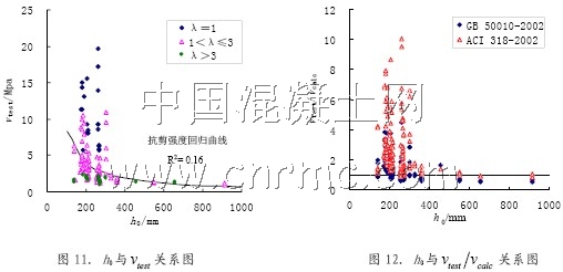 試驗(yàn)數(shù)據(jù)分析表明,無腹筋梁的抗剪強(qiáng)度受尺寸效應(yīng)的影響。即在混凝土強(qiáng)度、縱筋配筋率和剪跨比一定的情況下,隨著梁的有效截面高度增加,抗剪承載力呈下降趨勢,如圖11 所示。尺寸效應(yīng)的原因可以解釋為,隨著截面高度的增加,在斜裂縫的寬度增大,骨料之間的咬合作用削弱,導(dǎo)致承載能力下降。圖11 還表明尺寸效應(yīng)的大小與剪跨比密切相關(guān),對于λ>3的梁,有效高度對抗剪強(qiáng)度幾乎沒有影響。
