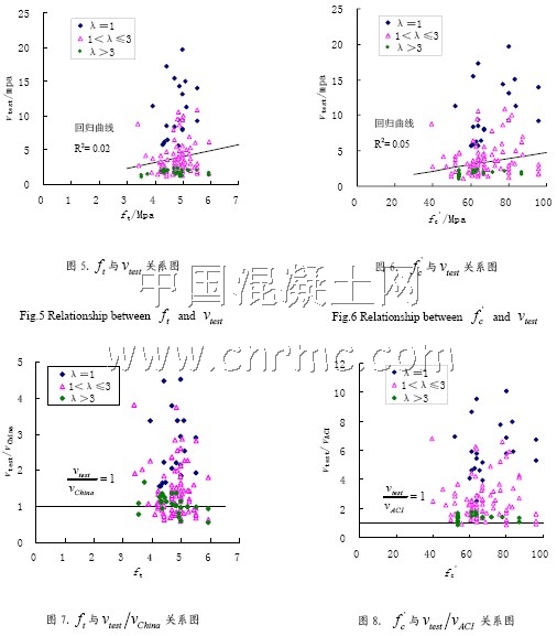 無腹筋混凝土梁的剪切破壞最終由混凝土材料的破壞控制,所以其剪切承載力隨混凝土的強(qiáng)度而提高。不同剪跨比的梁,因其破壞形態(tài)的差別,承載力分別取決于混凝土的抗壓和抗拉強(qiáng)度。中國規(guī)范用的是混凝土抗拉強(qiáng)度ft,美國規(guī)范用的是混凝土圓柱體抗壓強(qiáng)度fc。在圖5和圖6中分別給出混凝土抗拉強(qiáng)度ft和抗壓強(qiáng)度fc與梁抗剪強(qiáng)度試驗(yàn)值vtest 的關(guān)系圖,圖中可見,vtest與ft和fc有大致的線性關(guān)系,但是數(shù)據(jù)的離散性很大,回歸曲線的相關(guān)系數(shù)都很低。圖7 給出了抗剪強(qiáng)度試驗(yàn)值與中國規(guī)范計算值比值vtest/vChina與混凝土抗拉強(qiáng)度ft之間的關(guān)系圖。圖中可以看出,隨著ft的增加,vtest/vChina<1的點(diǎn)越多,說明混凝土強(qiáng)度越高,中國規(guī)范計算的抗剪強(qiáng)度安全度越低。從圖中還可以看出vtest/vChina<1的點(diǎn)多為剪跨比λ>3的梁,可見中國規(guī)范對于大剪跨比的高強(qiáng)混凝土梁不夠安全。圖8 為抗剪強(qiáng)度試驗(yàn)值與美國規(guī)范計算值比值vtest/vACI與混凝土抗壓強(qiáng)度fc之間的關(guān)系圖,圖中幾乎所有的點(diǎn)都在vtest/vACI=1以上,可見美國規(guī)范用于高強(qiáng)混凝土無腹筋梁抗剪強(qiáng)度計算是安全的。