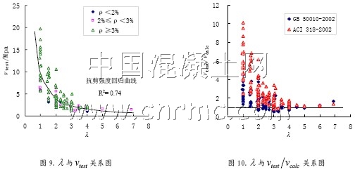 梁的剪跨比反映了梁的剪切破壞形態(tài),是梁抗剪強(qiáng)度的主要影響因素。圖9 給出了梁的剪跨比與抗剪強(qiáng)度試驗(yàn)值之間的關(guān)系,可以看出,剪跨比與抗剪強(qiáng)度的相關(guān)性較好。當(dāng)剪跨比由小增大時,在λ<2 區(qū)間,抗剪強(qiáng)度下降很快;2≤λ≤3區(qū)間,抗剪強(qiáng)度的變化已經(jīng)很小。λ>3以后,剪跨比對梁的抗剪強(qiáng)度影響不大。這主要是因?yàn)榱涸诳辜暨^程中同時存在“梁作用”和“拱作用”λ<3時“拱作用”較大,而λ>3以后“拱作用”逐漸減弱造成的。圖10 為剪跨比與抗剪強(qiáng)度試驗(yàn)值與計算值的比值test calc v v 的關(guān)系圖,圖中給出了試驗(yàn)值與中國規(guī)范計算值的比值點(diǎn)和試驗(yàn)值與美國規(guī)范計算值的比值點(diǎn)。可見在剪跨比λ < 2 時,兩國規(guī)范數(shù)據(jù)點(diǎn)均在vtest/vcalc=1以上,說明兩國規(guī)范公式在此區(qū)間都是安全的,但是美國規(guī)范比中國規(guī)范要保守;而當(dāng)λ≥2 時,中國規(guī)范有相當(dāng)一部分點(diǎn)落在了vtest/vcalc=1以下,說明中國規(guī)范公式對于大剪跨比的梁不安全;美國規(guī)范當(dāng)λ>3時也不安全。