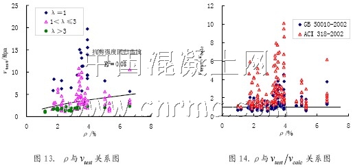 縱向鋼筋除了直接提供銷栓力以外,還使梁的中和軸降低,從而加大了斜裂縫頂部混凝土受壓區(qū)高度,間接提高梁的抗剪承載力。圖13 給出了縱筋與抗剪強(qiáng)度之間的關(guān)系,可見隨著縱筋配筋率的增加,梁的抗剪強(qiáng)度增大,但是數(shù)據(jù)離散性很大,縱筋配筋率與梁的抗剪強(qiáng)度的相關(guān)性較差。圖中還顯示對于小剪跨比的梁,縱筋配筋率對抗剪強(qiáng)度影響較大,但是當(dāng)剪跨比λ > 3時,增大縱筋率對梁的抗剪承載力幾乎沒有影響。圖14 則表明了梁抗剪強(qiáng)度試驗(yàn)值與計算值的比值隨縱筋配筋率之間的關(guān)系,圖中無論是用中國規(guī)范還是用ACI 規(guī)范計算,均有部分?jǐn)?shù)據(jù)點(diǎn)落在了vtest/vcalc=1以下,