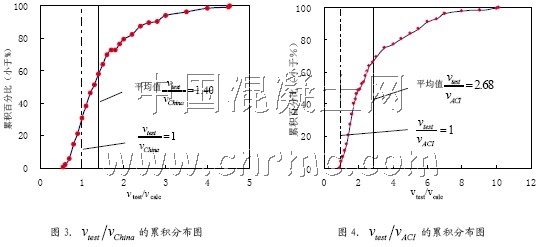 為了更直觀的體現(xiàn)試驗(yàn)抗剪強(qiáng)度小于計算抗剪強(qiáng)度的梁所占的比例,做試驗(yàn)值與計算結(jié)果比值的累積布圖于圖3和圖4。圖3顯示,試驗(yàn)值與中國規(guī)范計算結(jié)果比值vtest/vChina小于其平均值1.40 的數(shù)據(jù)占總數(shù)據(jù)的58%,vtest/vChina<1的數(shù)據(jù)占總數(shù)據(jù)的31%。圖4 表明,試驗(yàn)值與ACI 規(guī)范計算結(jié)果比值vtest/vACI小于其均值2.68 的數(shù)據(jù)占總數(shù)據(jù)的68%,vtest/vACI<1的數(shù)據(jù)占總數(shù)據(jù)的4%。