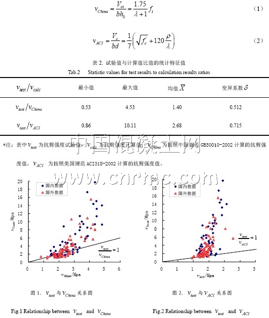 對收集到的試驗(yàn)數(shù)據(jù),分別根據(jù)我國規(guī)范GB50010-2002 抗剪公式(1)和ACI 318-2002抗剪公式(2)進(jìn)行抗剪強(qiáng)度的計算。將試驗(yàn)值與計算結(jié)果的比較列于表2,可見vtest/vChina的均值為1.4,離散系數(shù)為0.512;而vtest/vACI的均值為2.68,離散系數(shù)為0.715。表明對于高強(qiáng)混凝土無腹筋梁的抗剪強(qiáng)度計算,ACI 規(guī)范安全度較高,但是偏于保守,中國規(guī)范的試驗(yàn)結(jié)果符合情況相對較好,但是安全度有所降低。