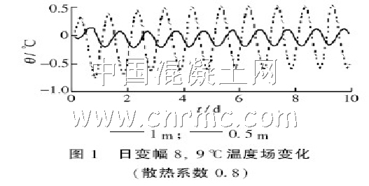 由于混凝土絕熱溫升曲線常用表達(dá)式為θ=θ0 (1- e- m t),絕熱溫升θ0 的影響是成比例關(guān)系。若放熱系數(shù)不變,取0. 16,邊界為固氣熱交換,則絕熱溫升增加+ 1 ℃ ,在混凝土3 m 深處,混凝土溫度值增加+ 1 ℃ 左右;1m深處6d為+ 0.5℃ ,12d 為+0.60℃ 。