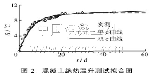 煤灰后期水化發(fā)熱,擬合采用雙e 曲線更好。圖2是我國南方某一工程混凝土絕熱溫升測試結(jié)果及曲線 模擬,可以看出采用雙e 曲線更能符合實(shí)際情況[4]。