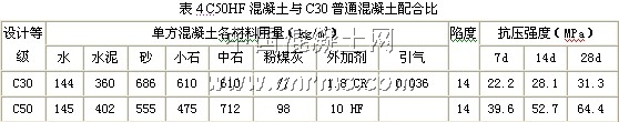 4.1.2外加劑及骨料:普通混凝土使用CR型緩凝減水劑和CS型引氣劑,硅粉混凝土使用UNF-5高效減水劑,HF混凝土使用HF外加劑。骨料(略)。