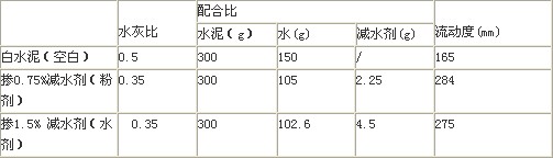 在白水泥熟料中,C4AF含量極低,混合材摻量也不高,水泥粉磨細(xì)度一般不超過(guò)500m2/kg。在實(shí)際應(yīng)用情況中,白水泥與減水劑的適應(yīng)性不確定,有時(shí)表現(xiàn)良好,有時(shí)表現(xiàn)極差。筆者就白水泥與外加劑的適應(yīng)性問(wèn)題先后做過(guò)2次試驗(yàn),白水泥都是從裝飾材料商店取得,具體礦物成分不詳;減水劑采用常州新建混凝土外加劑有限公司的TS-萘系高效減水劑。但2次試驗(yàn)結(jié)果卻截然相反,第一次在300克金貓牌白水泥中分別摻入0.75%的粉劑和1.5%的水劑,在W/C為0.35的情況下做凈漿流動(dòng)度試驗(yàn),居然做不出結(jié)果;而另一次在同樣的方法下用銀潔牌84º425#白水泥進(jìn)行試驗(yàn),卻顯示出與減水劑較好的適應(yīng)性,試驗(yàn)結(jié)果如下: