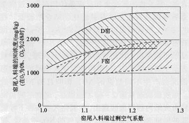 圖7為德國(guó)2臺(tái)回轉(zhuǎn)窯窯尾人料端NO濃度與過(guò)剩空氣系數(shù)的關(guān)系。D窯為Ф3.8m/3.2m×48m日產(chǎn)熟料1550t的5級(jí)旋風(fēng)預(yù)分解窯;F窯是Ф6.Om/5.6m×90m日產(chǎn)熟料3100t的半干法窯。從中可以看出,過(guò)剩空氣系數(shù)只有降到1.1以下才能顯著降低NO形成量,然而降低過(guò)剩空氣系數(shù)會(huì)產(chǎn)生還原性煅燒,對(duì)熟料質(zhì)量不利,所以這一措施很少采用。