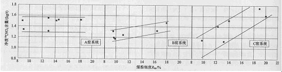 試驗(yàn)中的煤粉細(xì)度以90 μm篩余表示,窯系統(tǒng)排放凈氣體中的NOX排放量以熟料日產(chǎn)量為基準(zhǔn)按日平均值計(jì)算,如圖9所示。從試驗(yàn)中得出,使用普通多通道燃燒器的A窯,單位熟料NOX排放量與煤粉細(xì)度沒(méi)有關(guān)系。使用低一次空氣燃燒器的B和C窯,NOX排放量都隨煤粉平均粒徑變大而增高。其原因是煤粉的燃盡時(shí)間隨顆粒增大而加長(zhǎng),這樣就有更多的未燃盡煤粒從貧氧火焰核心逸出,在與二次空氣激烈混合的火焰部位繼續(xù)燃燒,由此提高了這一部位的局部火焰溫度及氧含量,兩者都能促進(jìn)NO的形成。一次空氣的軸向總沖量越大,煤粉細(xì)度對(duì)NO形成的作用越明顯。IFRF的研究報(bào)告指出,提高一次空氣的旋流沖量,能強(qiáng)化煙氣的再回流,降低火焰核心的O2分壓,若提高一次空氣的軸流沖量會(huì)將更多的二次空氣吸人火焰內(nèi),結(jié)果使較小的煤粉顆粒也在較高O2分壓下燃燒,以致?lián)]發(fā)性組分中的氮化合物被更多地氧化成NO,低一次空氣燃燒器貧氧火焰核心和煙氣再回流的作用就有可能被抵消。C窯的軸流風(fēng)壓和風(fēng)速較高,雖然使用低一次風(fēng)燃燒器,在較粗煤粉細(xì)度下與使用普通多通道燃燒器的A窯具有相同的NOX排放量。