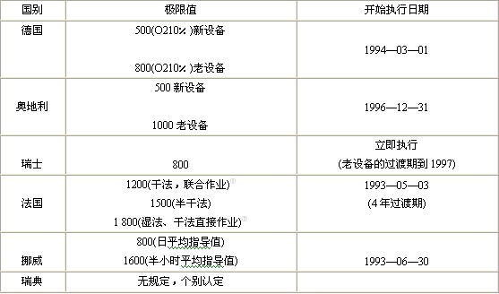 表5 1996年幾個(gè)歐洲國(guó)家的水泥窯NOX排放極限水平 以NO2計(jì),mg/m3