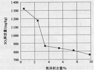 圖1 在試驗(yàn)反應(yīng)器中生料粉的SO2釋放量與氣體中氧含量的關(guān)系