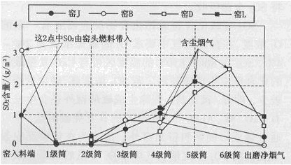在半干法窯上由于在濕料球中碳酸鹽和硫化物的分解幾乎同時(shí)進(jìn)行,釋放出的SO2能被新生成的CaO所吸收,而潮濕氣氛更有利CaO或CaC03與S02反應(yīng)。因此在半干法窯上測(cè)不出廢氣S02排放量與原料帶人硫化物間有明顯的相互關(guān)系。