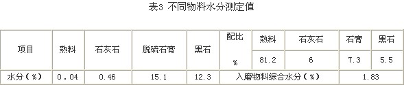 (1) 我們對(duì)六七號(hào)水泥磨使用的原材料進(jìn)行了水分測(cè)定,樣品的取樣地點(diǎn)是二期水泥配料站。測(cè)定結(jié)果見(jiàn)下表3: