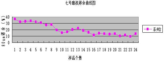 圖一 七號(hào)磨機(jī)的篩余曲線 1~8號(hào)為一倉(cāng),9~24號(hào)為二倉(cāng)